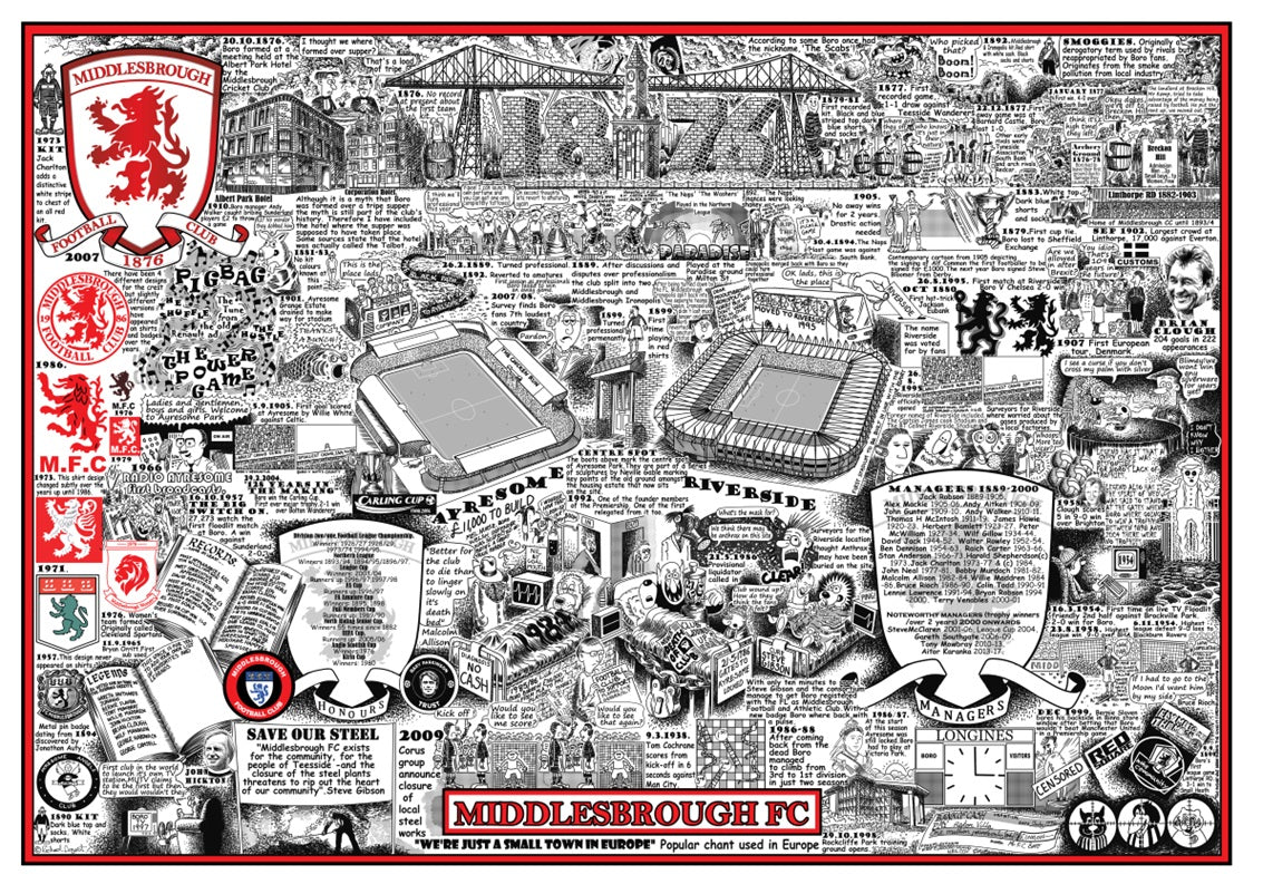 Black and white cartoon print depicting the history of the club.
