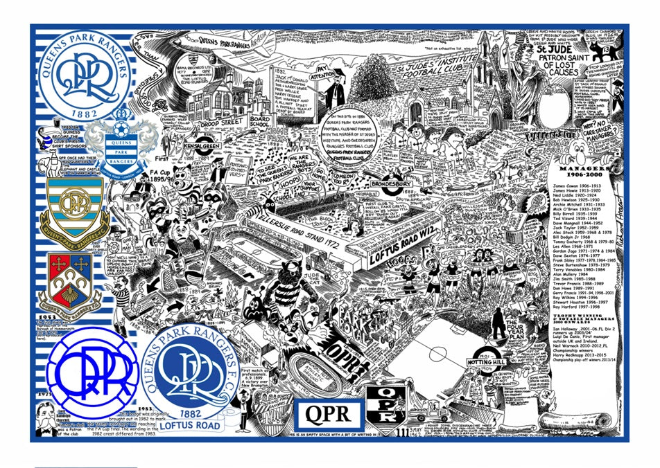 Black and white cartoon print depicting the history of the club.